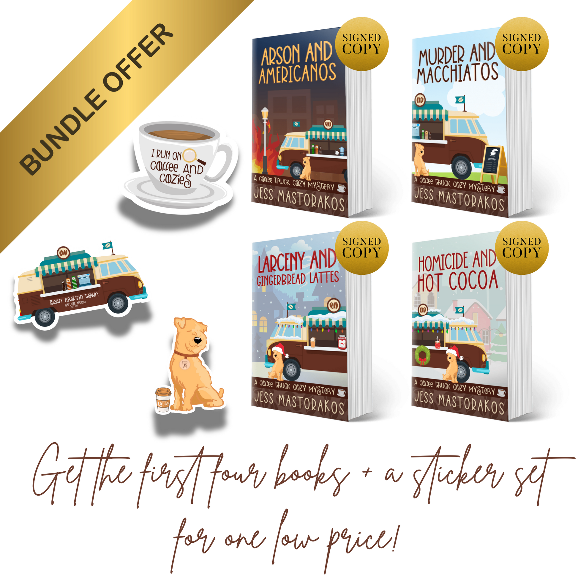 This bundle includes four signed paperbacks and one sticker pack from the Coffee Truck Cozy Mysteries series!